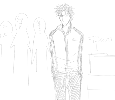 今日跡部の歌のときのベンチで乾とかがやっと何やってるかわかったのをメモった。(らくがき)