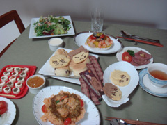 料理はEさんのお手製&マイコさんの持ち込みです。ローストビーフ、パエリア、ピラフ、サラダにスコーンとクッキー。