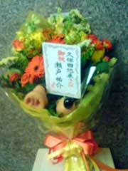 何段階にもボケを用意する周到さ。さすがです。花束にもよくみるとわかるけど、ハンズで買った「鼻」が混じってて(豚鼻、ミッキーの鼻)ここにはないけどアキシンの鼻もあって、それは会場の方のプレゼントになってました。アキシンのように話しかける二人にひきぎみの司会者…。今日(日曜)のゲストはアキシンだったので多分その話もでたでしょう。ホントに氷帝はみんな仲良くてほほえましい。