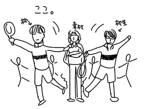 私のところに回ってきたとき、皆さん無難な「うさぎ」とか「りんご」とか描いてて、実は無機物が苦手なおいら…人間つかキャラ描いたらまずいかな…と思いつつ隣の人から「コマ」で回ってきて「ま…ま…」で「マンゴー」しか浮かばないけどマンゴーなんて描けない(形がよくわからん)そしたら「マサ」ってでてきて、マサは描けないけど「雅治」(仁王)なら…と仁王を描きました…。